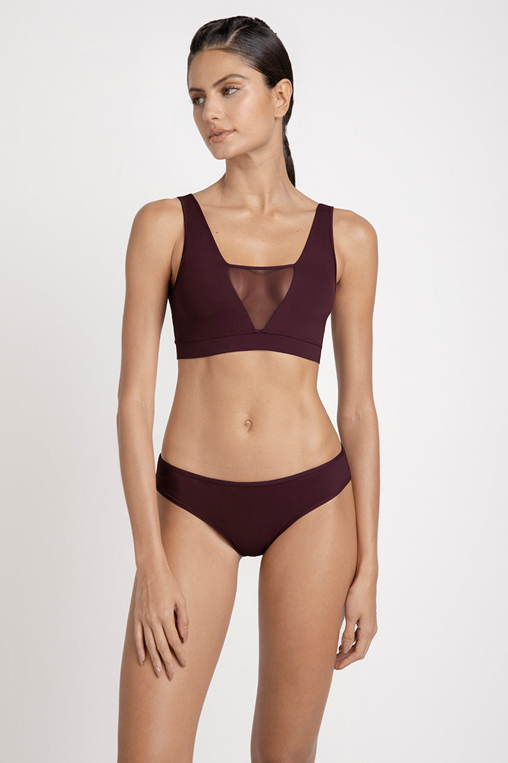 Top deportivo con doble lycra y tull en escote, Color Vino, Ref. 1499V32