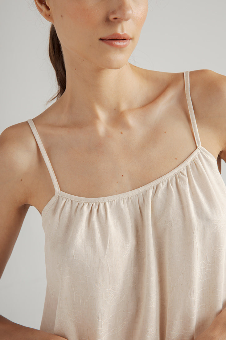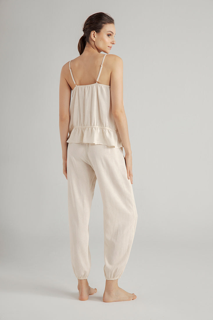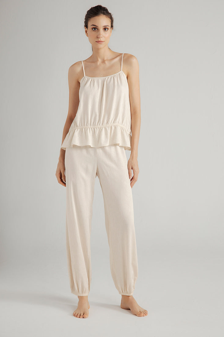 Pijama pantalón elaborada en viscosa fondo entero con un grabado floral. Camisa de tiras, elástico en cintura y cargaderas ajustables. Pantalón con elástico en bota. Color Arena, Ref. 1512041