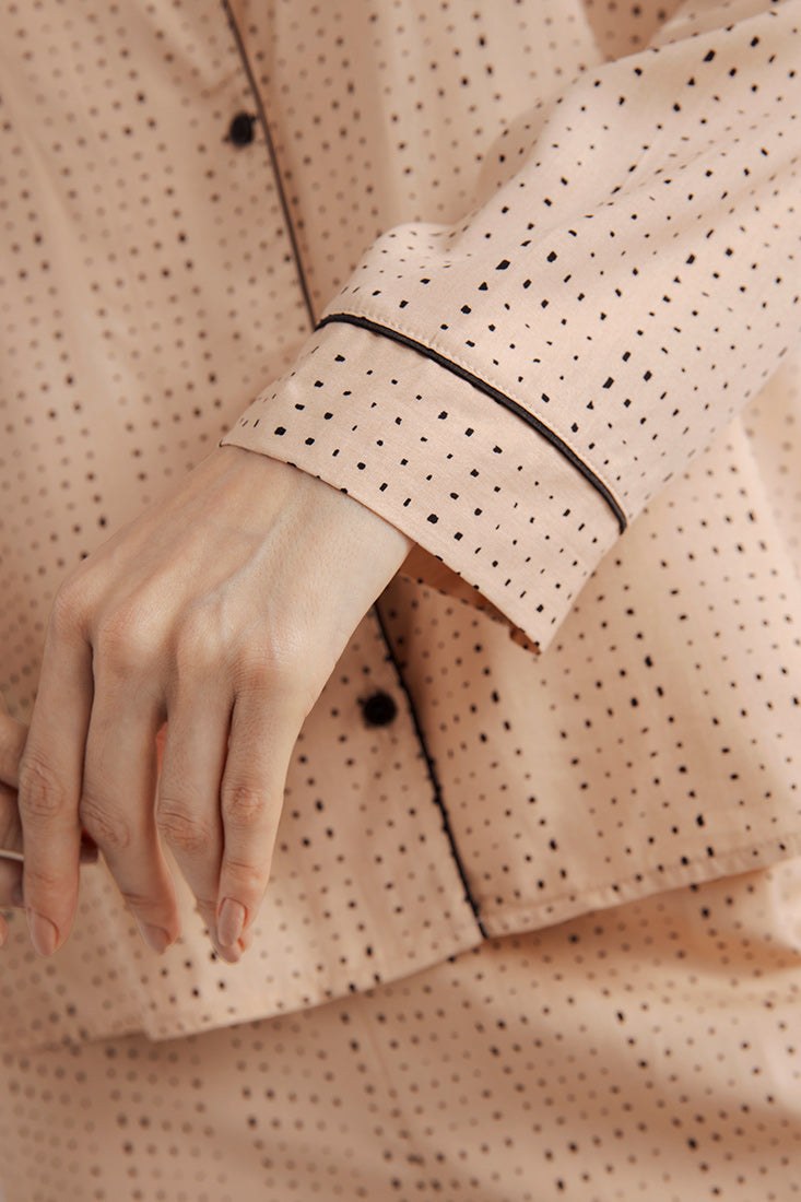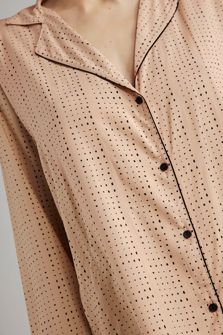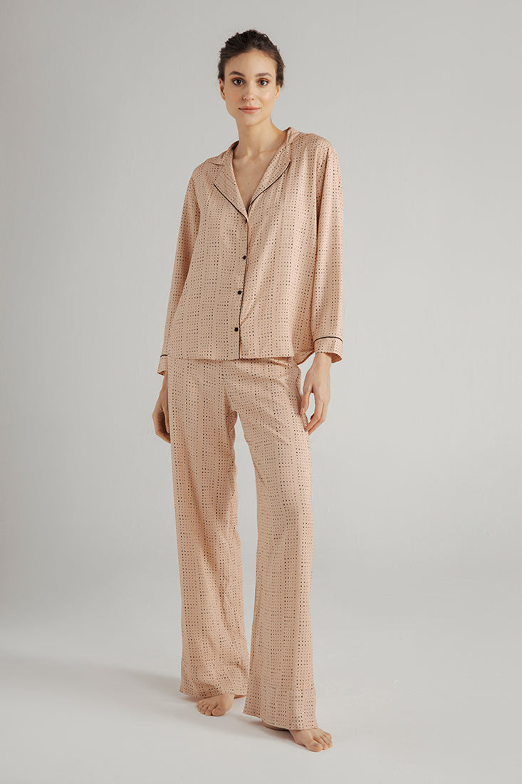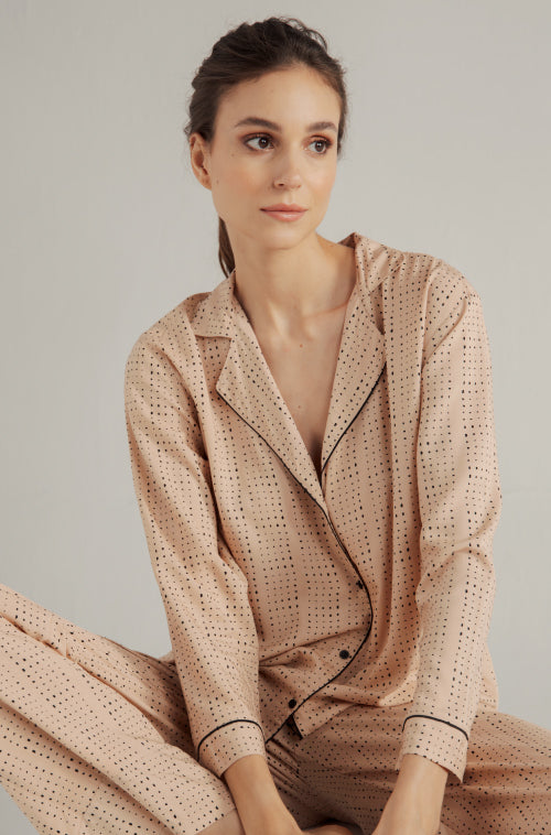 Pijama pantalón elaborada en viscosa estampada de mini puntos. Camisa manga larga, con cuello resort y perilla de botones con vivos en contraste. pantalón largo con bota recta y elástico en cintura. Color estampado, Ref. 1539041