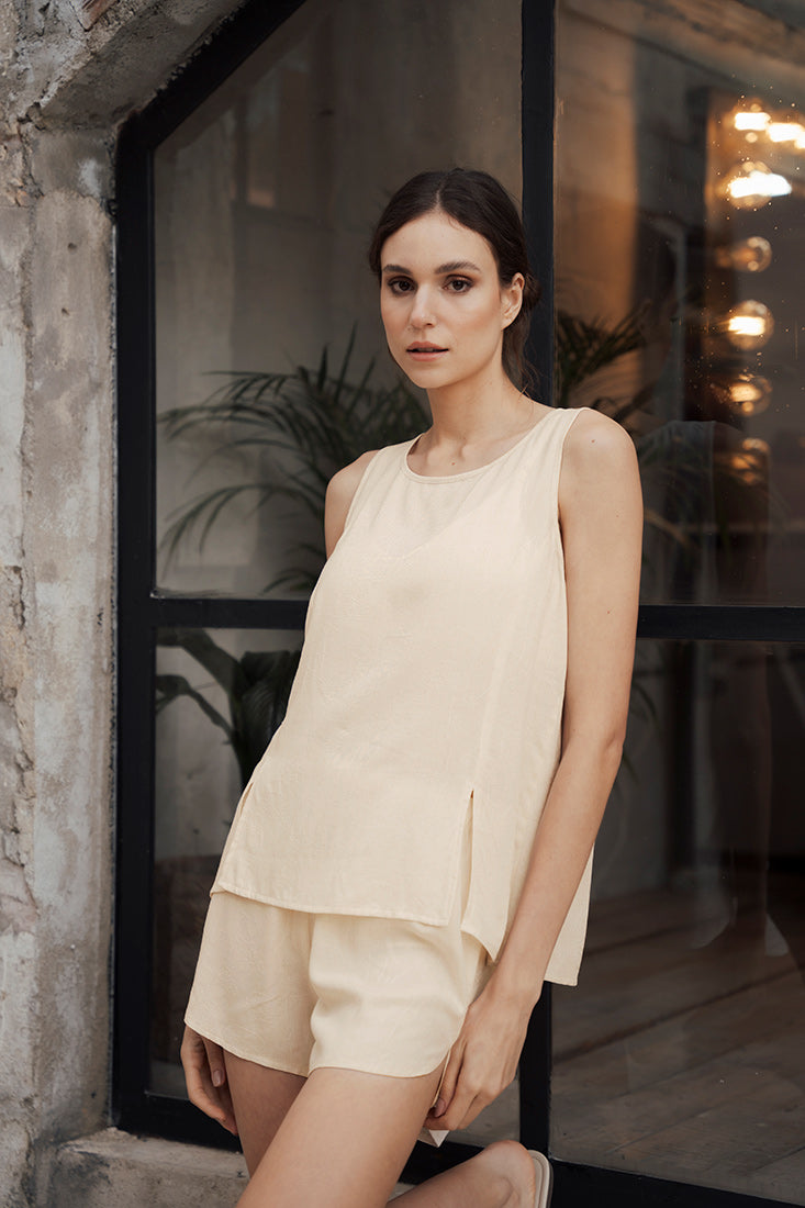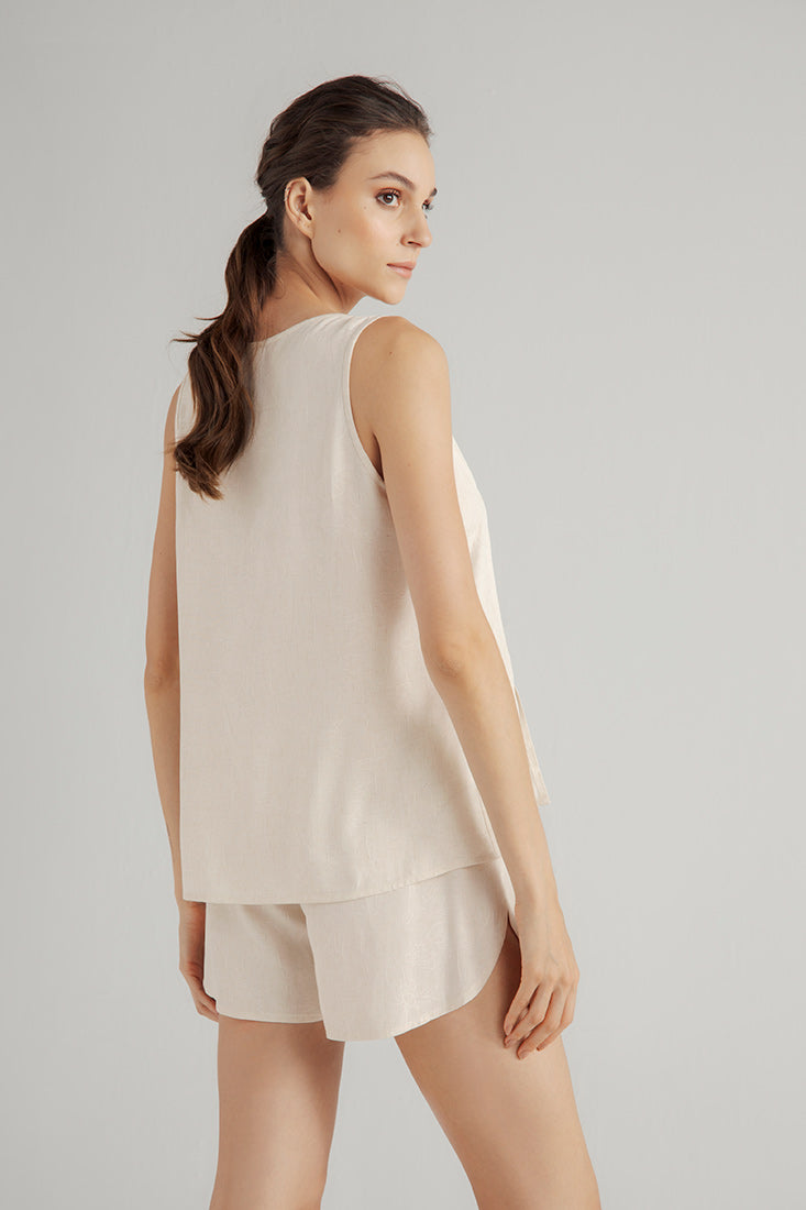 Pijama Short elaborada en viscosa fondo entero con un grabado floral. Camisa sin mangas con abertura en delantero. Short en silueta deportiva. Color Arena, Ref. 1513041
