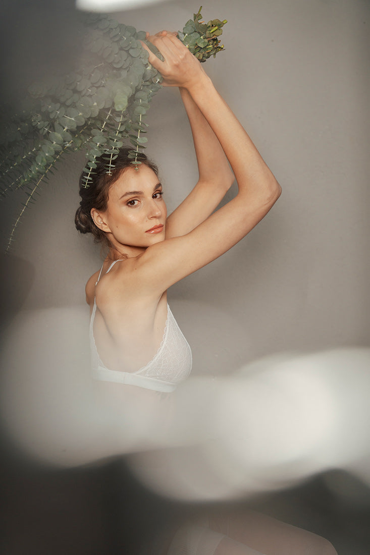 Bralette elaborado en encaje con copa removible, banda elástica en contorno y tul en centro. Color off white, Ref. 1474042